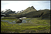 Nach der Karte macht die Piste nun einen weiten Bogen nach Norden, um einen Berg herum, während Landmannalaugar selbst westlich und nur in 3 Kilometer Entfernung liegt. Genau aus dieser Richtung kommt eine kleine Reitergruppe aus einem Seitental und schwenkt dann auf die Piste nach Norden. Aha! An der Mündung des Tales angekommen steht dort ein Schild "Für Jeeps verboten" - also Pferde und Fußgänger erlaubt. Es ist der alte Weg der mir über den niederen Paß der Kýlingarskarð den ganzen nördlichen Umweg erspart. Erst mal bin ich froh von der etwas langweiligen Piste weg zu sein, auch wenn ich dadurch nicht die Brücke benutzen kann. Dafür stehe ich dann unmittelbar vor Landmannalaugar - aber auf der falschen Seite des Jökulgilskvísl und muß mir erst mal eine geeignete Stelle zum Furten suchen. Inzwischen ist auch die Reitergruppe von Norden her auf meiner Flußseite eingetroffen und sie machen sich zügig ans Furten. Die Reiter müssen die Füße weit anheben um nicht naß zu werden, also ist es an dieser Stelle für mich schon fast zu tief. Weiter oberhalb ist es günstiger, aber selbst dort geht mir das Wasser bis weit die Oberschenkel hoch. So, nun noch über den Damm und ich stehe auf den Zeltplatz von Landmannalaugar.