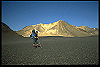 Im Abstieg von der Paßhöhe kommt zuerste eine etwas unangenehme Querung von steilen Altschnee- und grobblockigen Geröllfeldern. Dann folgt der lange, breite Rücken, der den Südrand des Jökuldalurs bildet. An seinem Ende kann ich schon die leuchtend roten Dächer der beiden Hütten von Nýidalur erkennen. Aber man darf sich nicht täuschen lassen. Das sind noch 8 km und zwei ordentliche Gegenanstiege dort hinunter. Der Blick auf den wie in einer Auslage präsentierten Hofsjökull und auf die steile Schlucht Kaldagil, welche mit ihren Gletscher die Südflanke des Tungnafell durchschneidet, bietet Abwechslung genug. Den letzten Berg auf dem Rücken spare ich mir schließlich und steige steil und weglos nach Süden ab. Meine Knie sind nicht gerade begeistert über diese Tortur. Mit jedem Höhenmeter weniger nimmt die Wärme zu. Dann noch über die gewalzte Piste des Behelfslandeplatzes und dann den letzten Kilometer über die staubige Sprengisandurpiste zu der Hütte von Nýidalur. "Sailing home ..." wieder mal habe ich den alten Ohrwurm im Kopf und gröle vor mich hin - solange ich sicher sein kann, daß mich niemand hört. Zieleinlaufstimmung!