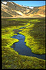 Am Hangfuß des Göngubrun mache ich Pause an einem klaren Bach. Das Bachwasser ist fast handwarm und ein leicht schwefeliger Geruch weist auf die heißen Quellen hin, die sich weiter oben am Hang befinden. Langsam steige ich dann bergauf. Hin und wieder gelblich und rötlich verfärbter Boden und weißliche Sinterbildungen. Aber kaum spektakuläre Heißwaseraustritte. Das Auffälligste ist jedoch die üppige Vegetation mit vielen Blütenpflanzen und dichten Rasenpolstern. Exposition, Wasserangebot und vor allem die effektive Fußbodenheizung sorgen für ein Pflanzenwachstum das es hier eigentlich gar nicht geben dürfte. Ein Grund mehr sich genüßlich auf dieser Almwiese in die Sonne zu legen und den Blick über die blendenden Eisflanken der Báðarbunga und über das sich im Horizont verlierende Eisfeld des Kaldakvíslarjökulls schweifen zu lassen. In der Mitte des sich wie ein weite Bucht öffnenden Snappadalurs liegt die dunkelgraue Masse des Deilir.