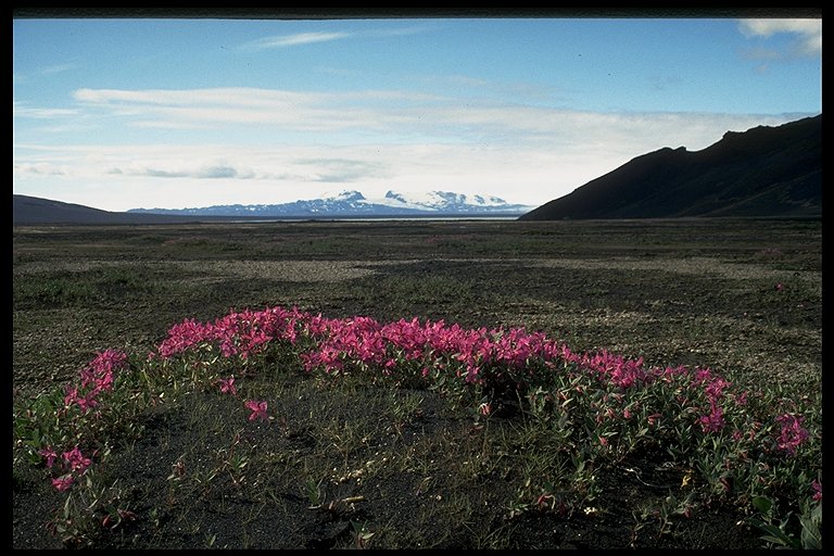 Arktische Weidenröschen in einem trockenen Bachbett nahe dem Dyngjuvatn