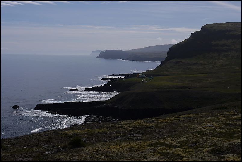 Ich gehe in trockenen Schuhen und trockene Strümpfen - was für ein Luxus! Die letzten Tage hatte ich nur die Neoprensocken getragen! Ich dachte ich hätte schon Schwimmhäute zwischen den Zehen. Meine Tagesetappe führt über die Almenningaskarð zur Hornvík. Gleich zu Beginn hat man einen schönen Blick auf die freistehenden Klippe der Fjalir. Geologisch gesehen sind die Fjalir nichts anderes als jüngere Gangfüllungen aus hartem Basalt welche die alten fast horizontal gelagerten Basaltdecken senkrecht durchbrechen. Nur wenig weiter muss man die enge Kluft der Blakkibás mit ihren senkrechten Felswänden umgehen. Zurück auf den sanft geneigten Heidehängen kommt man zu einem Wegweiser an dem man sich entscheiden muss zwischen dem direkten Weg zur Hornvík über die Kýrskarð und dem weitern Weg über die Almenningaskarð, der über die Halbinsel Horn führt. Mein Weg führt zur Almennigaskarð hinauf.