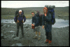 Danach verabschiede ich mich von den drei Jungs. Inzwischen habe ich ihnen das meiste, was ich über ihre geplante Strecke weiß mitgeteilt und ihnen die wichtigsten Tips gegeben (wo gibt es kein Wasser und wo gibt es wann zuviel Wasser). Ich bin zuversichtlich, die schaffen das mit Kraft und Unbekümmertheit. Für den Rest des Tage will ich eine gemächlichere Gangart einlegen und lasse sie voranstürmen. Aber schon nach 2 km sehen wir uns an der nächsten Furt wieder, denn sie mußten sie durchwaten. Nun sind dabei zum letzten Mal für die nächsten 2 Tage voll aufzutanken. Ich kann ihnen dafür noch vorführen wie man mit Hilfe von Skistöcken über die Steine balancieren und damit trockenen Fußes über den Bach kommt. Auch ich versorge mich noch hier noch mit 5 Liter klarem Wasser für die nächsten Tage. Dann geht es auf die lange, sandige Gerade, genau nach Westen auf den Herðubreið zu. Es regnet zwischendurch mal kurz, aber der Wind wird immer kräftiger und hält den Sand in Bewegung. Bimsstein mag zwar gut gegen die Hornhaut sein, aber nicht für die Augen - also Gletscherbrille und Sturmhaube. Meinen alten Zeltplatz zwischen den mit Strandhafer bewachsenen Dünen lasse ich rechts liegen und trotte weiter die schier endlos gerade Piste entlang.