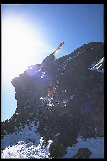 Überklettern der Schlüsselstelle nun mit Ski und "großem" Rucksack