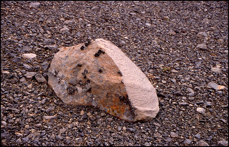 Seite des Steins können sich sogar Flechten halten. Der Übergang von der sandgestrahlten Seite zu der normal